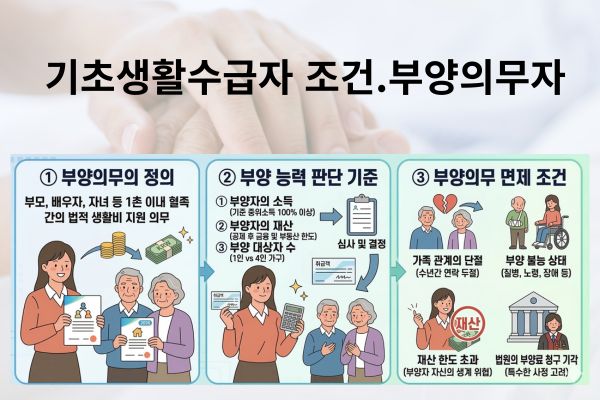 - 기초생활수급자 조건 — 소득·재산·부양의무자 3가지 기준 모두 충족 필요